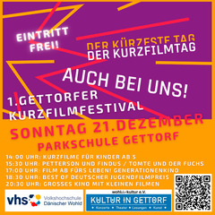 Gettorf ist in diesem Jahr zum ersten Mal beim Kurzfilmtag dabei - Deutschlands größter Aktionstag rund um den kurzen Film. Ob Kino oder Klassenzimmer, Kulturhaus oder Wohnzimmer - am kürzesten Tag des Jahres, dem 21. Dezember, feiern wir die Vielfalt des Kurzfilms. Von bewegend bis bizarr, von politisch bis poetisch: Kurzfilme erzählen große Geschichten in kurzer Form - verdichtet, kreativ und überraschend! Für jedes Alter.